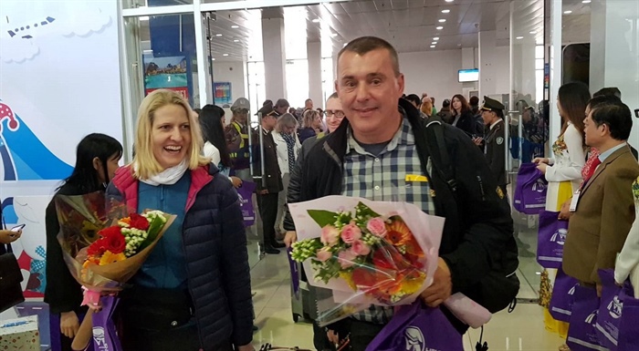 Những vị khách quốc tế đầu tiên đặt chân xuống sân bay Phú Bài, bắt đầu "xông đất" cố đô Huế Ảnh: SƠN THÙY
