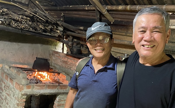 Tác giả (bìa trái) và ông chủ Bảo tàng Đồng Đình ở Đà Nẵng, bên cạnh bếp củi than