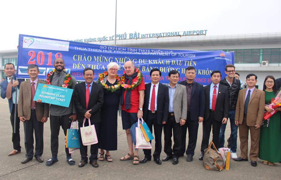 Gần 200 du khách trên chuyến bay VN1543 từ Hà Nội đi Huế đã được chào đón nồng nhiệt bởi màn biểu diễn lân sư rồng truyền thống. Lãnh đạo ngành du lịch địa phương cũng đã tặng hoa và những món quà lưu niệm đặc trưng của xứ Huế đến đoàn khách. Riêng vị khách đầu tiên đến Huế năm 2018 bằng đường hàng không là ông Allicock Stephangary (quốc tịch Hoa Kỳ) đã được Vietnam Airlines trao tặng món quà là một vé khứ hồi nội địa có giá trị sử dụng trong năm 2018.