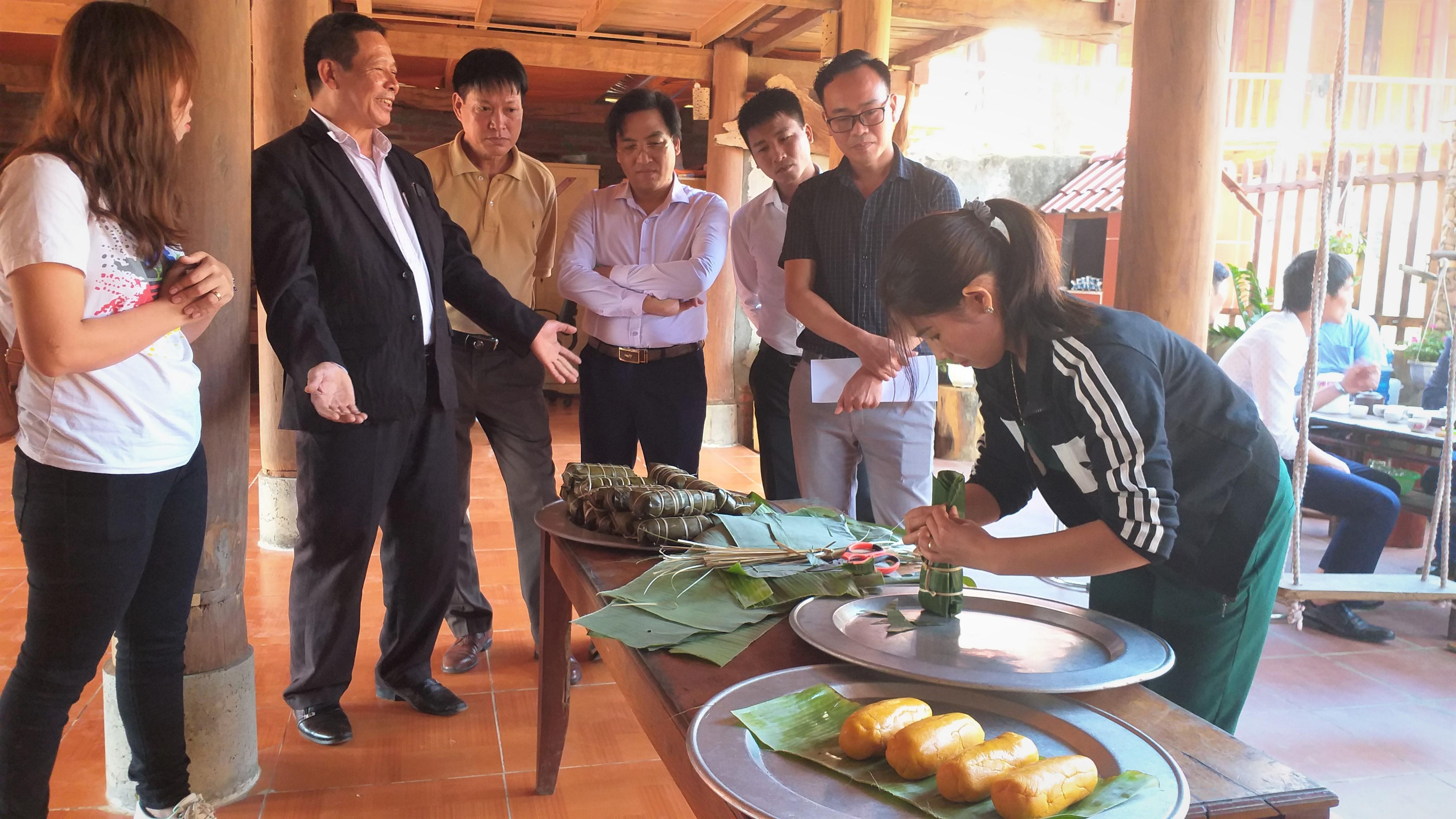 Du khách trải nghiệm làm bánh truyền thống ở làng du lịch sinh thái cộng đồng Hữu Liên