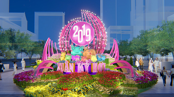 Đáng chú ý, đại cảnh “Tinh hoa vươn cao” cuối Đường hoa là một chuỗi tiểu – đại cảnh thống nhất dài khoảng 50m. Búp hoa lớn nhất ở giữa làm bằng khung sắt, formex tạo hình và mica màu viền led hé lộ con số 2019 với khát vọng trong năm Kỷ Hợi 2019, TP. HCM sẽ tiến thêm một bước quan trọng trên hành trình trở thành thành phố thông minh, phát triểu bền vững trong nhiều lĩnh vực.