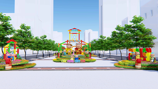Trong đó, khu vực Tượng đài Chủ tịch Hồ Chí Minh trước trụ sở UBND TP. HCM được trang trí dựa trên ý tưởng thể hiện mùa xuân trên thành phố mang tên Bác với sắc mai vàng và hoa đào khoe sắc ngày Tết truyền thống. Dọc hai bên được bố trí những chậu hoa mai tạo thành đường dẫn từ Đường hoa hướng về phía Tượng đài Bác Hồ. Cùng với đó là những nụ đào hồng bung nhụy khoe hương những ngày Xuân. Cả khu vực được trang trí tạo nên không gian ngày Tết ấm tình dân tộc, giản dị trong sự tôn nghiêm và trang trọng của khu vực Tượng đài Chủ tịch Hồ Chí Minh.
