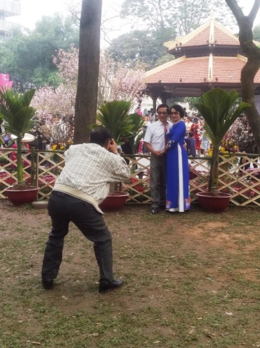 Nhiều người lớn tuổi ghi lại cho nhau những bức ảnh bên những cành Anh Đào