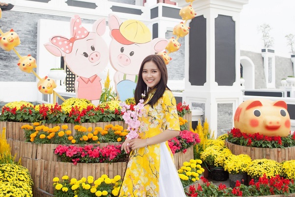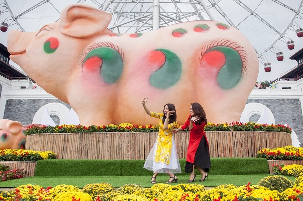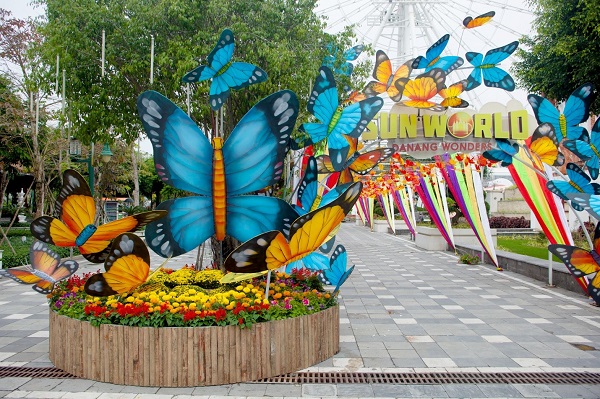 Công viên đẳng cấp Sun World Danang Wondersbiến hóa thành một khu vườn ngập tràn hương sắc mùa xuân với lễ hội “Heo vàng gõ cửa” diễn ra từ ngày 5 - 14/2/2019 (tức mồng 1 đến mồng 10 Tết Kỷ Hợi). Hàng loạt đại cảnh, tiểu cảnh được trang hoàng lộng lẫy khắp công viên chủ đề lớn nhất miền Trung. Hoa hiện diện khắp nẻo với đủ sắc màu, đặc biệt là cả một đàn bướm khổng lồ rập rờn chào đón du khách chơi xuân.