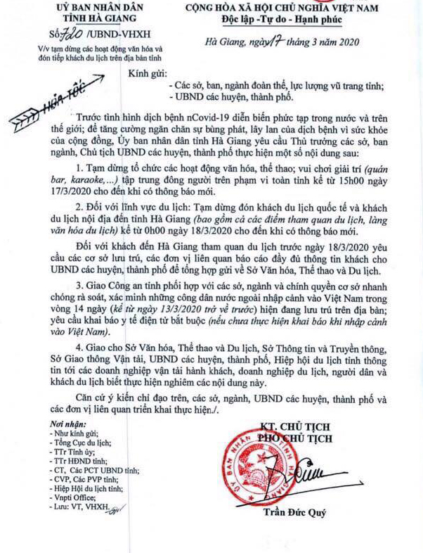 Theo đó, UBND tỉnh Hà Giang quyết định tạm dừng tổ chức các hoạt động văn hóa, thể thao, vui chơi giải trí (quán bar, karaoke…) tập trung đông người trên phạm vi toàn tỉnh kể từ 15h00 ngày 17.3 cho đến khi có thông báo mới. Hà Giang tạm dừng đón khách du lịch quốc tế và nội địa đến điểm tham quan du lịch.