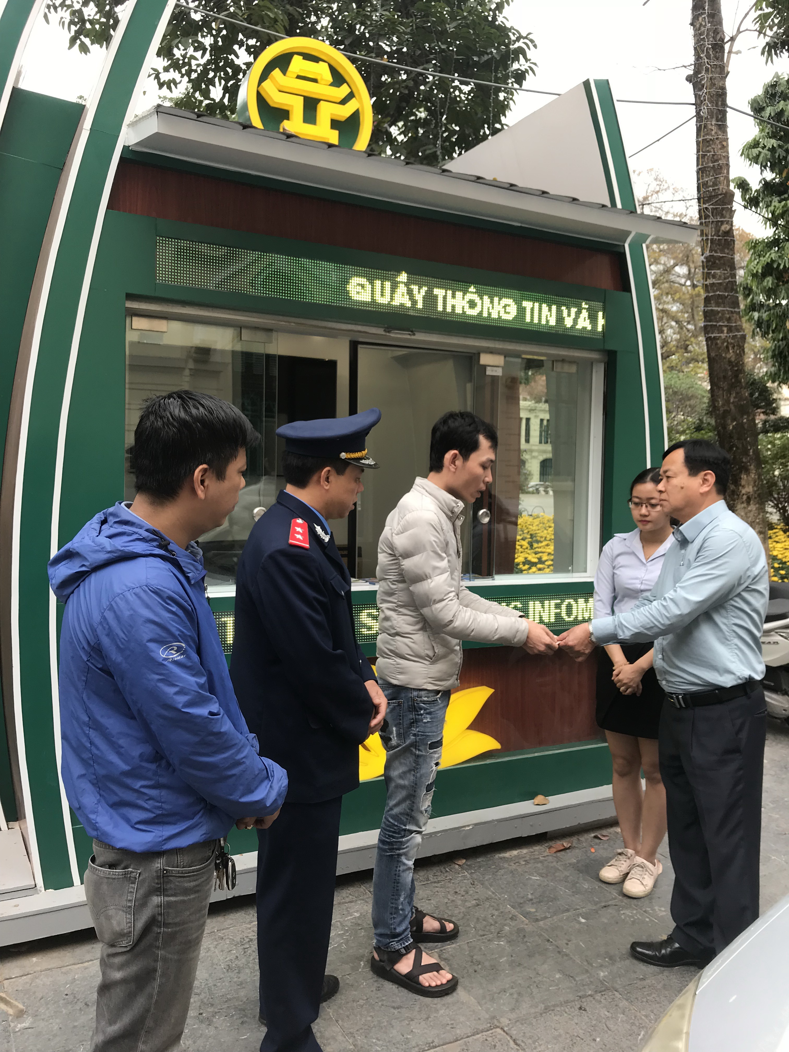 Tài xế taxi (người thứ 3 trái sang) gửi lại số tiền đã chiếm đoạt của du khách cho đại diện Sở Du lịch Hà Nội