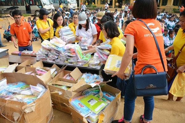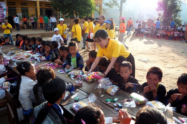 Nằm lọt giữa bốn bề núi rừng, lưng áp bên dãy núi cao, giữa khoảng sân trường rộng lớn, một nhóm trong đoàn từ thiện đang tập trung chia bánh, sữa, kẹo vào từng túi riêng để một lát nữa sẽ phát cho các em nhỏ, đảm bảo em nào cũng nhận được phần quà bằng nhau. Nhóm nam và các bạn trẻ thì nhanh chóng chuyền tay từng thùng thực phẩm, quần áo ấm, chăn bông… tập kết vào sân trường. Trong lúc này, các em nhỏ mải cười nắc nẻ với các trò chơi nhanh tay nhanh mắt, nhảy theo nhịp điệu của các chú gà con...