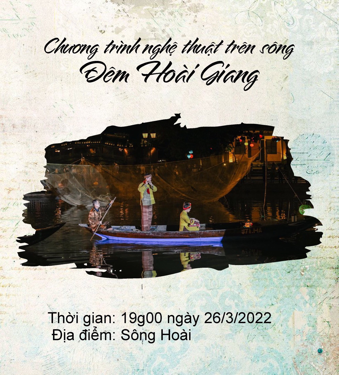 Chương trình nghệ thuật trên sông Đêm Hoài Giang diễn ra lúc 19g00 ngày 26.3 và hoạt cảnh Trang phục Hội An - Ký ức thời gian lúc 19g và 20g ngày 27.3 tại Vòng cung Chùa Cầu sẽ tái hiện một cách sống động cảnh sinh hoạt thường nhật, biểu diễn hò khoan đối đáp và giới thiệu đến khán giả các loại trang phục của người Hội An xưa.