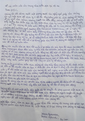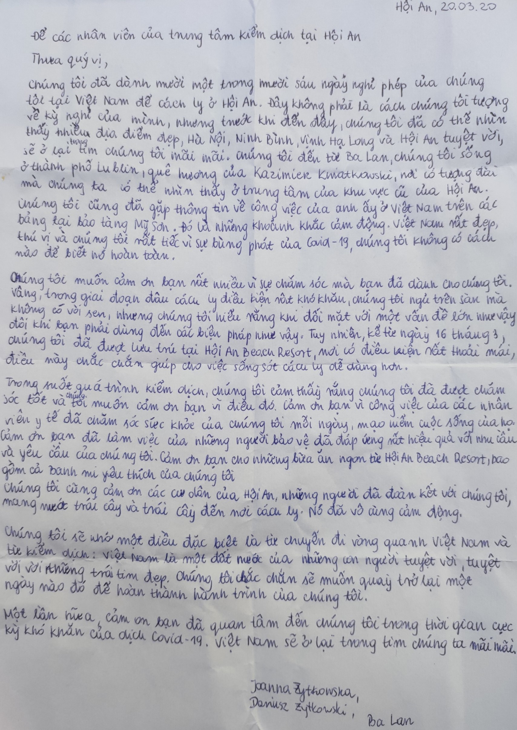 Hai du khách người Ba Lan, Joanna Zythowska và Denisz Zythowski đã có kết quả xét nghiệm âm tính và đang thực hiện cách ly theo quy định 14 ngày tại Khu lưu trú an toàn Hội An Beach Resort (TP. Hội An) đã tra google để viết tay bức thư bằng tiếng Việt gởi lời cảm ơn đến các nhân viên Trung tâm Kiểm dịch tại Hội An đúng vào ngày 20.3 - Ngày Quốc tế Hạnh phúc. Đây là một lời động viên chân thành, là món quà tinh thần để những người đang làm nhiệm vụ phòng, chống dịch Covid-19 những ngày qua thêm sức mạnh để tiếp tục nhiệm vụ.