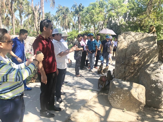 Du khách vui chơi cùng đàn khỉ được thả tự nhiên tại đảo Khỉ (Khu du lịch Long Phú)