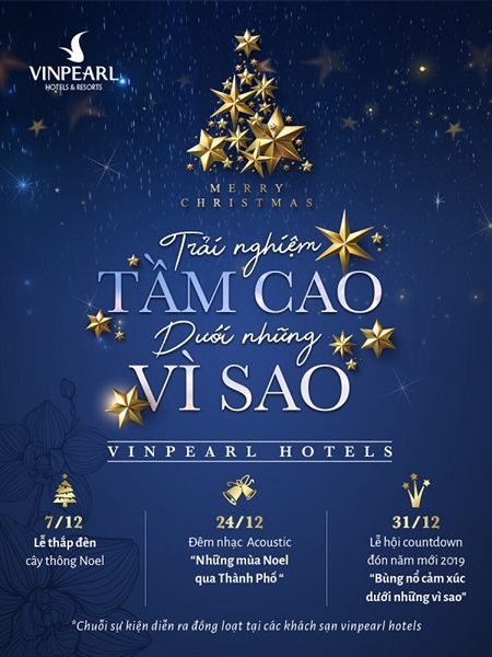 | Chương trình Cùng Vinpearl Hotels “Trải nghiệm tầm cao dưới những vì sao” Đêm 07/12/2018: Miễn phí tham gia chương trình Thắp sáng cây thông Noel tại các khách sạn Vinpearl Hotels trên toàn quốc Đêm 24/12/2018: Ưu đãi thưởng thức tiệcBuffet đêm Giáng sinh với chi phí từ 400,000Đ – 1,4 triệu đồng/ khách (tùy khách sạn) với hơn 50 món ăn đặc sắc cùng các chương trình âm nhạc nghệ thuật sôi động, lucky draw, quà tặng giáng sinh... Vinpearl Hotel Thanh Hóa có đêm diễn của ca sĩ Lynk Lee và Vinpearl Hotel Huế chào đón Dương Trần Nghĩa khuấy động không khí đêm Noel. Đêm 31/12/2018: Tiệc Buffet Tất niên với chi phí từ 500,000 – 1,2 triệu đồng/ khách (tùy khách sạn) với hơn 70 món ăn đặc sắc cùng chương trình nhạc hội đón năm mới– bốc thăm may mắn vô cùng hấp dẫn. Đặc biệt, chương trình Countdown (đếm ngược) chào đón năm mới 2019 sẽ diễn ra hoành tráng tại không gian Sky Bar trên cao sang chảnh bậc nhất. Thông tin chi tiết vui lòng liên hệ Hotline 1900 636 699. |
