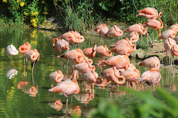 Đối nghịch với đàn tê giác “đồ sộ”, hổ Bengal, sư tử uy nghiêm là sự thanh thoát và rực rỡ của đàn hồng hạc vừa thức giấc, đang tỉa tót làm duyên bên hồ xanh um bóng cây. Hôm nay, bữa sáng của đàn hồng hạc là tôm và cua trộn hạt bắp ngon lành. Đàn chim yêu kiều nhất của vườn thú luôn thích thú khi được thưởng thức các món ăn như tảo xoắn, các loại hạt và đặc biệt không thể thiếu là động vật giáp xác. Chất tạo màu carotenoid bên trong loại thức ăn này sẽ được phân hóa thành những phân tử mang sắc tố hồng và cam, tạo nên bộ lôngtuyệt đẹp rực rỡ của loài chim quý.
