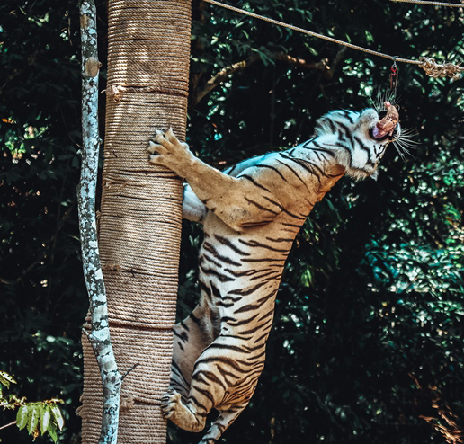 Ngay bên cạnh, những vị chúa sơn lâm đang chia nhau mỗi người một “lãnh địa” để săn thức ăn được giấu khắp khu rừng. Khi đánh hơi chính xác và định vị được mục tiêu, chỉ một cú song phi nhẹ nhàng đã nhấc bổng thân hình chúa sơn lâm đồ sộ lên không trung và chộp lấy chính xác miếng mồi tươi ngon được treo lơ lửng trên sợi dây thừng. Sư tử thích thú săn mồi là những bữa ăn ngon lành được giấu trong những bụi cây.