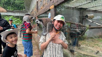 Thu Trang Tiến Luật và con trai thích thú tương tác cùng vượn cáo tinh nghịch