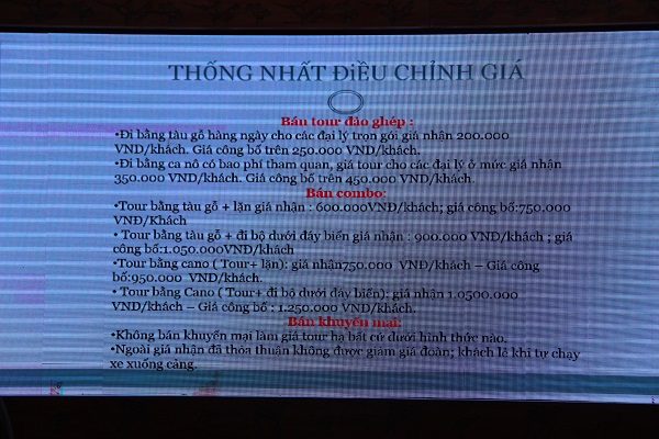 Để nâng cao chất lượng dịch vụ, đảm bảo an toàn cho du khách tham quan trên vịnh Nha Trang, tại Hội nghị lần này, các doanh nghiệp khai thác tour Đảo thống nhất nâng giá ve như sau: Tour 4 đảo đi bằng tàu gỗ lên 200.000 -250.000 đồng/vé; tour 3 đảo đi bằng ca nô có giá 450.000 đồng/vé. Đồng thời, các doanh nghiệp thống nhất cùng nhau đoàn kết, khai thác tour Đảo hiệu quả và cạnh tranh lành mạnh, không dành giật khách của nhau và đảm bảo an toàn cho du khách khi tham quan trên vịnh Nha Trang theo quy định của pháp luật.