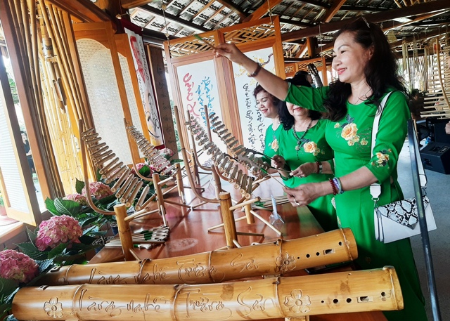 Du khách thích thú với các nhạc cụ do nghệ nhân chế tạc trưng bày tại Làng nghề Trường Sơn