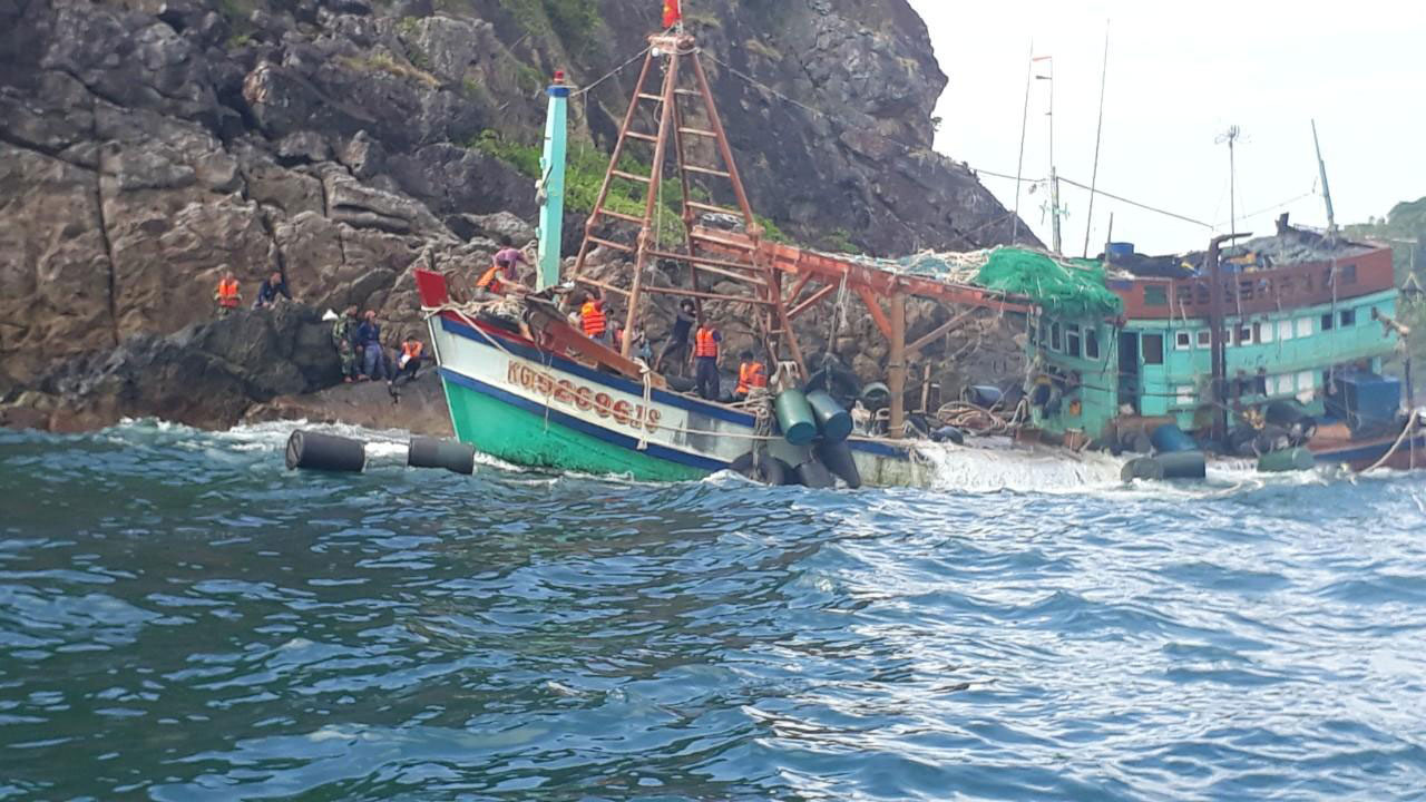 Chiến sỹ Đồn Biên phòng Nam Du giúp ngư dân neo đậu tàu tránh trú bão tại quần đảo Nam Du.