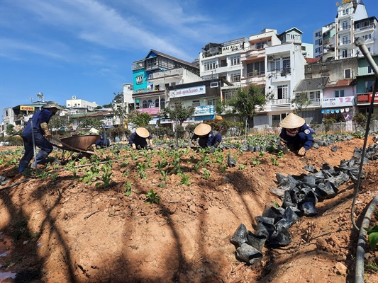 Các công nhân đang trồng 40.000 chậu hoa Chuông đỏ tại vườn hoa đường Nguyễn Văn Cừ để kịp nở vào dịp Tuần lễ Vàng Du lịch