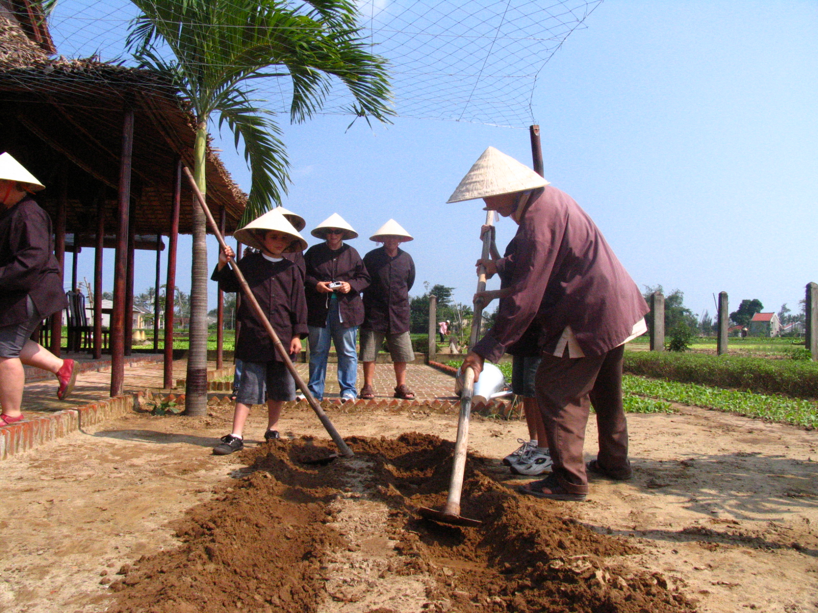 Du khách tham gia tour du lịch trải nghiệm làm nông dân ở làng rau Trà Quế, TP. Hội An, Quảng Nam