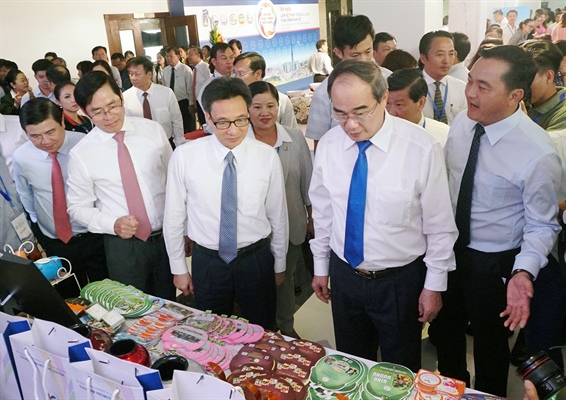 Phó Thủ tướng Vũ Đức Đam, Bí thư Thành uỷ TP.HCM Nguyễn Thiện Nhân và các đại biểu tìm hiểu sản phẩm văn hoá đặc trưng của vùng Đông Nam Bộ