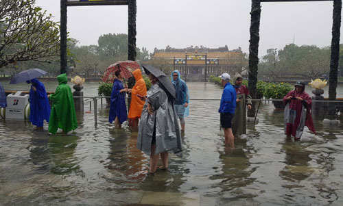 Ông Phan Thanh Hải, Giám đốc Trung tâm Bảo tồn di tích Cố đô Huế cho biết, Trung tâm chỉ mở cửa đón khách ở 4 điểm tham quan chính gồm: Đại Nội Huế, lăng Tự Đức, lăng Khải Định và lăng Minh Mạng, các điểm tham quan còn lại tạm thời đóng cửa vì ảnh hưởng của mưa lũ. Tại khu vực Đại Nội, hơn 90% diện tích không bị ngập nước, chỉ có đoạn qua cầu Trung Đạo nước dâng lên khoảng 20-30cm nên Trung tâm đã đặt rào chắn để không cho du khách đi lại. Nhiều du khách tỏ ra thích thú khi đứng nhìn cảnh nước, đàn cá chép bơi trong nước lũ ở khu vực này.