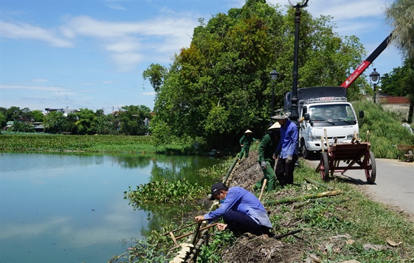 Đội ngũ nhân viên của Trung tâm tích cực chỉnh trang đoạn đê Kim Oanh của Hồ Tịnh Tâm
