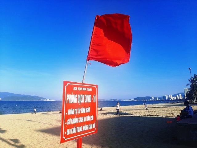 Biển cảnh báo phòng, chống dịch trên bãi biển Nha Trang