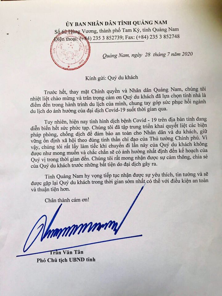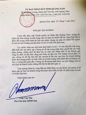 Cũng trong ngày 28.7, ông Trần Văn Tân, Phó chủ tịch UBND tỉnh Quảng Nam, đã gửi thư cho du khách đến du lịch ở tỉnh này.