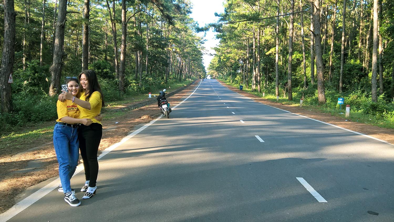 Hai du khách làm dáng chụp ảnh trên con đường thông vắng vẻ tuyệt đẹp