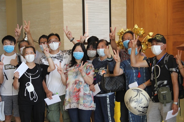 29 du khách nước ngoài vui mừng khi được UBND quận Hải Châu (TP Đà Nẵng) trao chứng nhận hoàn thành thời gian cách ly hôm 22.3. Trước khi ra sân bay về nước, các du khách bày tỏ sự cảm ơn lực lượng chức năng đã tận tình giúp đỡ họ trong thời gian cách ly Ảnh: H.N