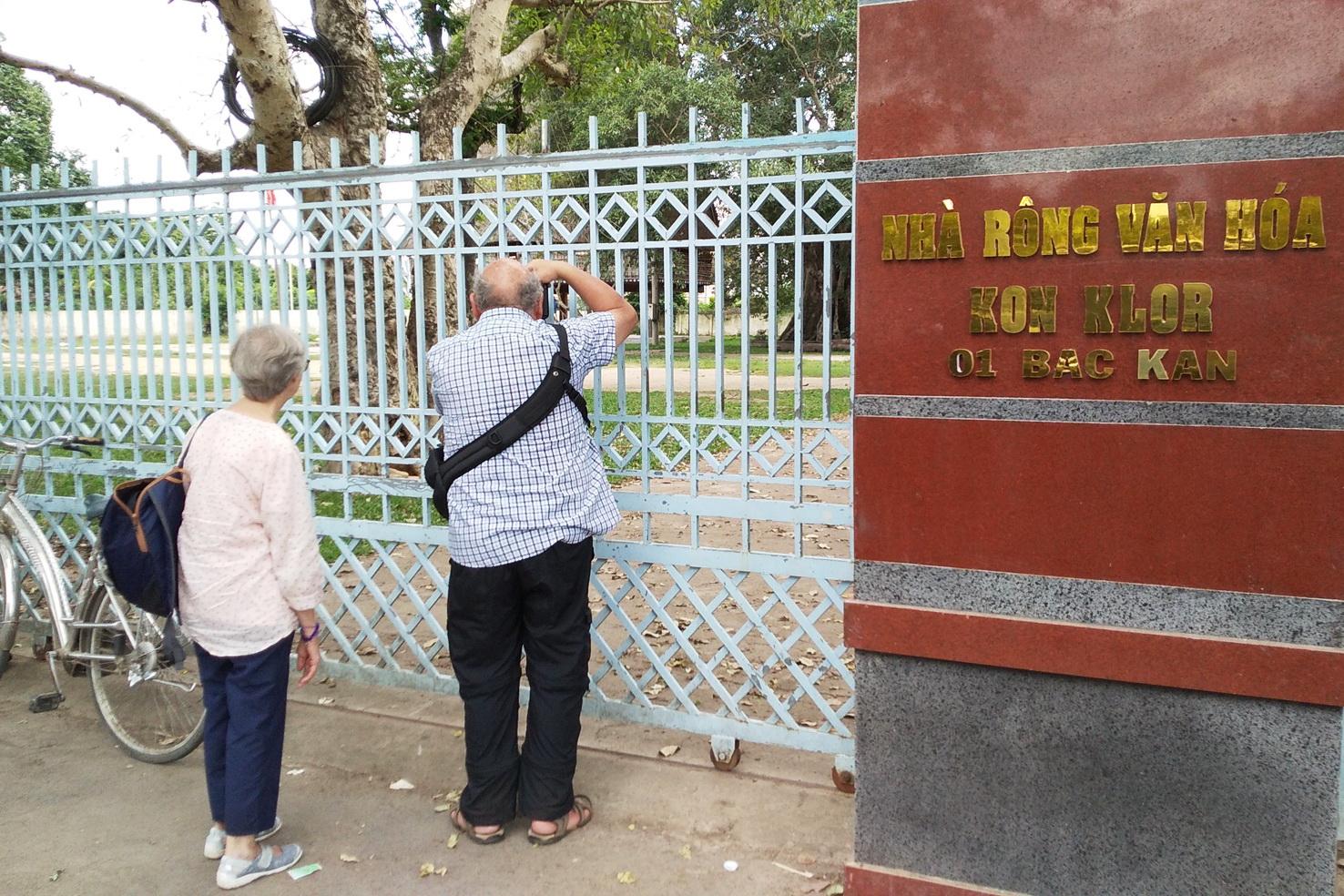 2 du khách quốc tịch Pháp ngắm, chụp ảnh nhà rông qua hàng rào sắt