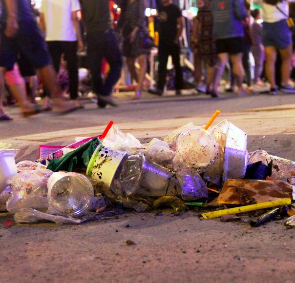 Sau khi ăn uống, du khách xả rác trên khắp mặt đường