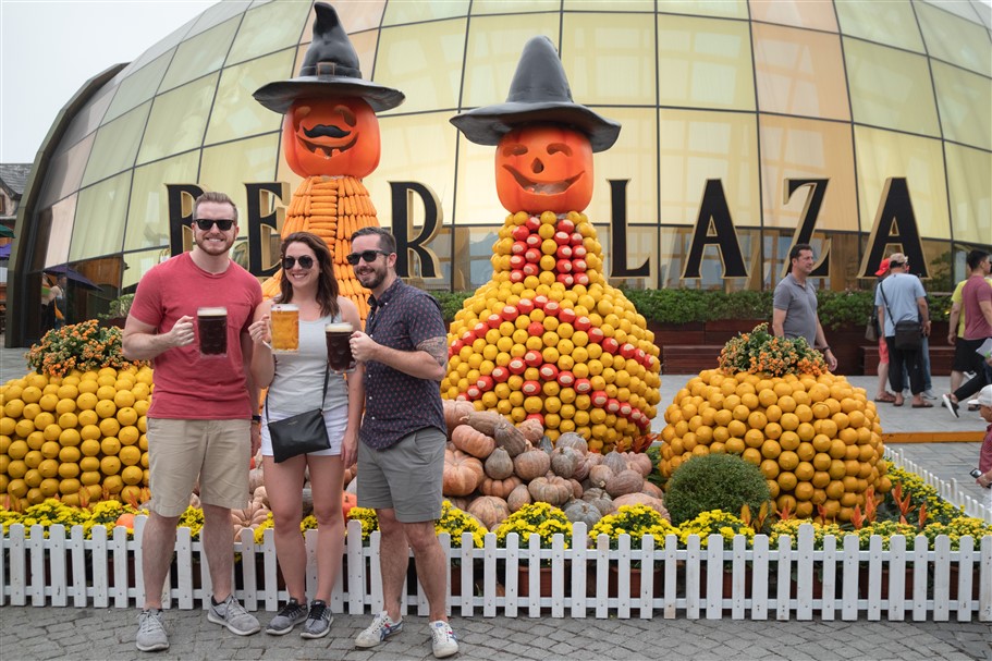 Quảng trường Beer Plaza những ngày này càng thêm rực rỡ, sôi động bởi sự xuất hiện của những đại cảnh, tiểu cảnh tạo hình từ bí ngô, vừa ngộ nghĩnh vừa ma mị, mang đậm chất Halloween.