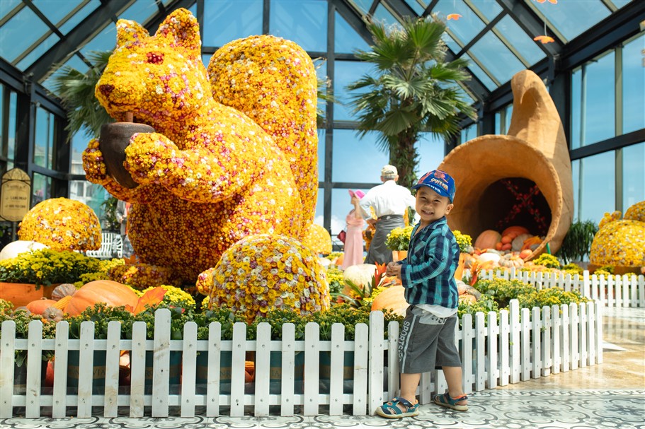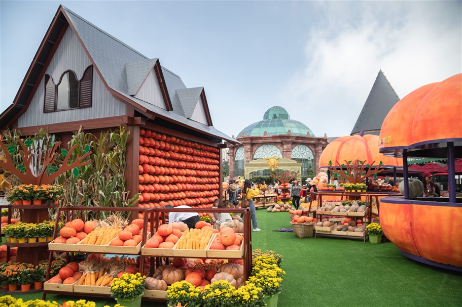 Sắc vàng rực rỡ của hàng trăm quả bí ngô đủ kích cỡ, những bắp ngô chắc mẩy và những đóa cúc rực rỡ khoe sắc đã tạo nên một không gian Halloween sinh động, rực rỡ, níu du khách dừng chân và lưu giữ lại những khoảnh khắc vô cùng ấn tượng của Halloween năm nay.