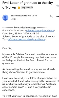 Ban chỉ đạo phòng, chống dịch Covid-19 tỉnh Quảng Nam cho biết, Tổ công tác làm nhiệm vụ ở Khu lưu trú an toàn dành cho người nước ngoài tại Hội An Beach Resort (số 1, Cửa Đại, Hội An) khi mở email công vụ đã nhận được bức thư bằng tiếng Anh của nữ du khách người Rumani vừa rời khu lưu trú an toàn quay về nước. Chủ nhân của lá thư là bà Cristina Daus – nữ Trưởng đoàn du lịch của nhóm 15 du khách đến từ từ Rumani, gửi lời cảm ơn đến Tổ công tác đang làm nhiệm vụ ở đây.