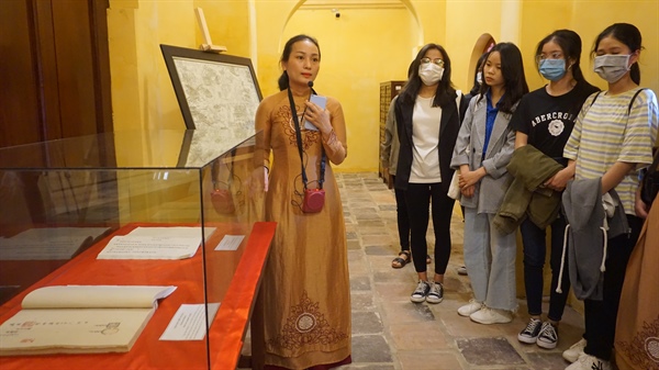 Các bạn trẻ tham quan, tìm hiểu tại không gian di tích Lầu Tàng Thơ (thuộc Kinh thành Huế)