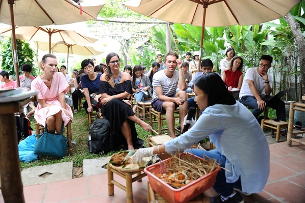 Du khách tham gia tour tìm hiểu mô hình tái chế rác thải du lịch thành sản phẩm thông dụng trong đời sống