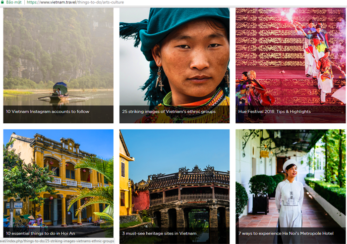 Ngoài ra, website cũng dẫn đến kênh mạng xã hội Facebook & Instagram chính thức của Du lịch Việt Nam, để khách quốc tế chủ động tương tác và chia sẻ trải nghiệm từ chính chuyến đi của họ. Các bài viết, phỏng vấn, video, tour 360 độ cùng hình ảnh được thiết kế chuyên nghiệp trên website nhằm mục đích giới thiệu Việt Nam là điểm đến du lịch thú vị và thuận tiện dành cho khách quốc tế.