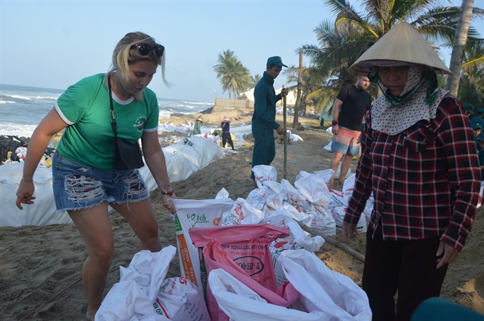 Khách du lịch cùng giúp người dân gia cố bờ biển Cửa Đại
