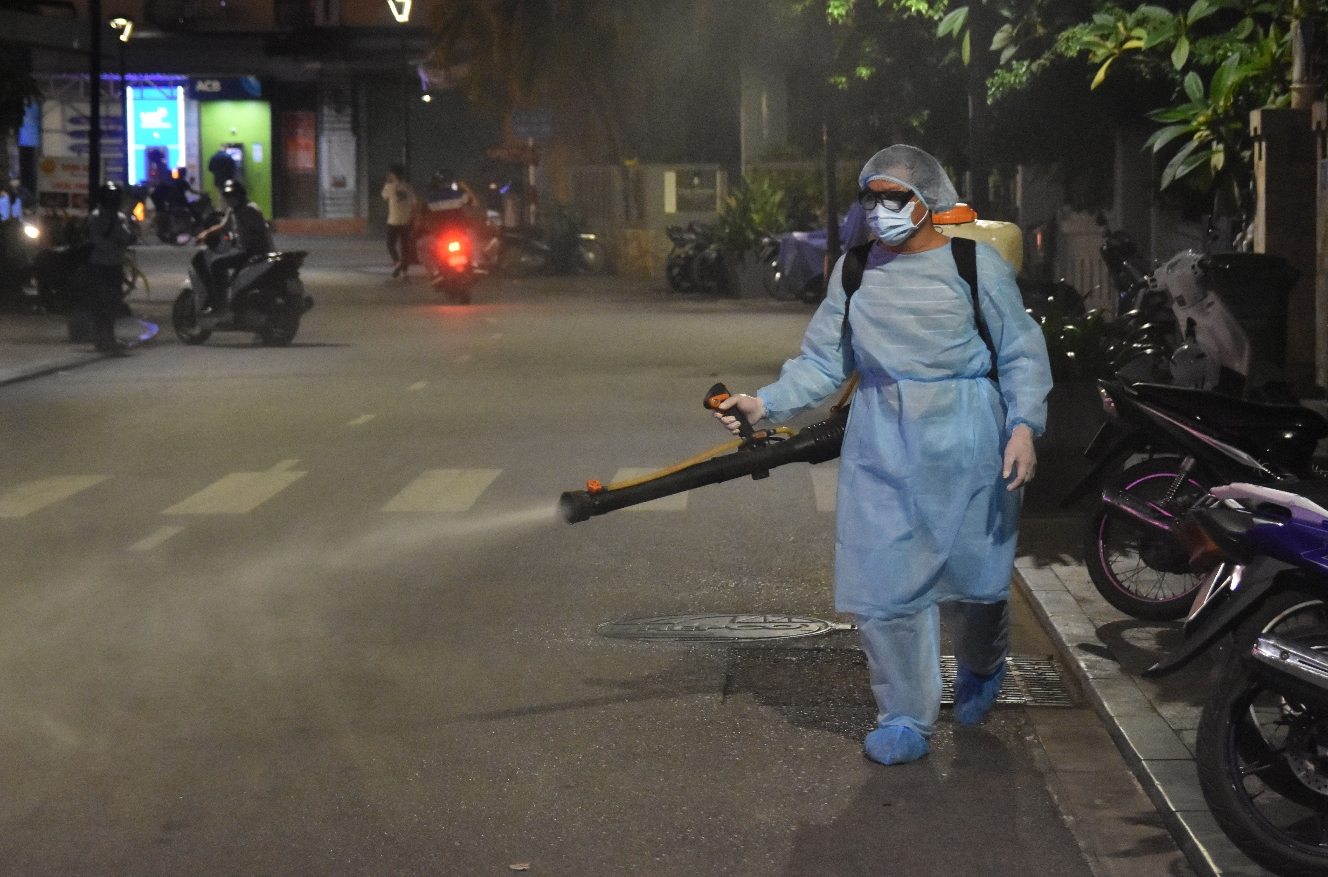 Đơn vị y tế tiến hành phun thuốc, xử lý môi trường ờ gần khu vực nữ bệnh nhân số 30 đi lại, ăn uống
