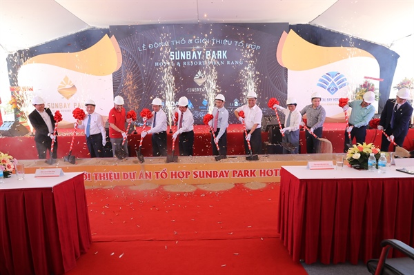 Tổng giám đốc NDA Group cùng đại diện Tập đoàn Crystal Bay và các đối tác trong sự kiện động thổ tổ hợp SunBay Park Hotel & Resort Phan Rang.