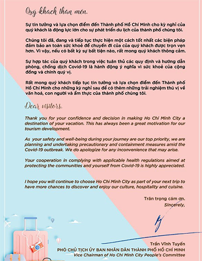 Nội dung của bức thư: “Quý khách thân mến. Sự tin tưởng và lựa chọn điểm đến TP.HCM trong kỳ nghỉ của quý khách là động lực lớn cho sự phát triển của thành phố chúng tôi. Chúng tôi đã, đang và tiếp tục thực hiện một cách tốt nhất các biện pháp, nhằm đảm bảo an toàn sức khỏe để chuyến đi của quý khách được trọn vẹn hơn. Vì vậy, nếu có bất kỳ sự bất tiện nào, rất mong quý khách thông cảm. Sự hợp tác của quý khách trong việc tuân thủ các quy định và hướng dẫn phòng chống dịch Covid-19 là hành động ý nghĩa vì sức khỏe của cộng đồng và chính quý vị. Rất mong quý khách tiếp tục tin tưởng và lựa chọn điểm đến TP.HCM cho những kỳ nghỉ sau, để có thêm những trải nghiệm thú vị về văn hóa, con người và ẩm thực của thành phố chúng tôi. Trân trọng cảm ơn”.