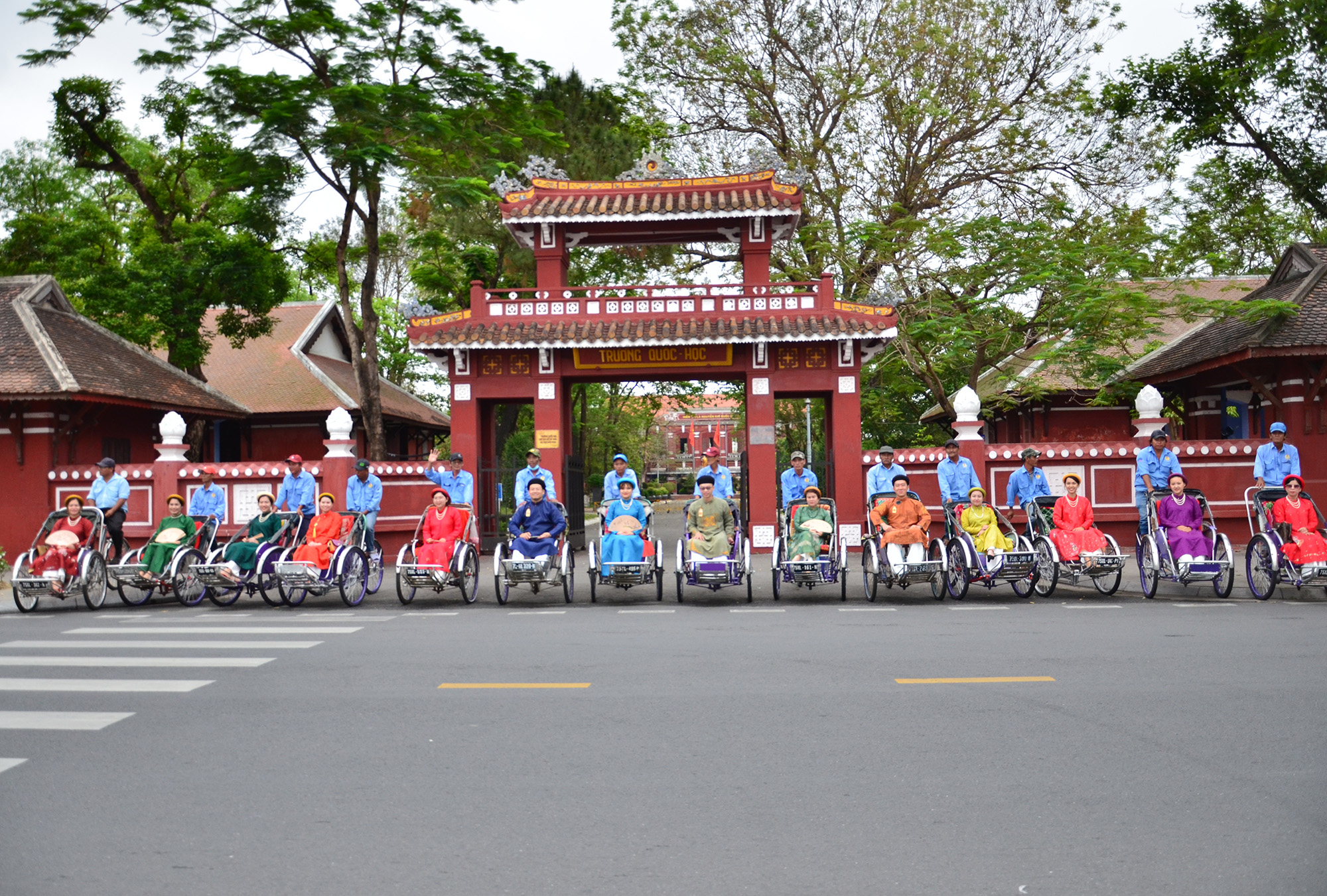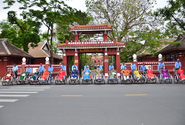 Đoàn du khách trải nghiệm tham quan thành phố Huế với áo dài ngũ thân. Ảnh chụp trước khi bùng phát dịch Covid-19