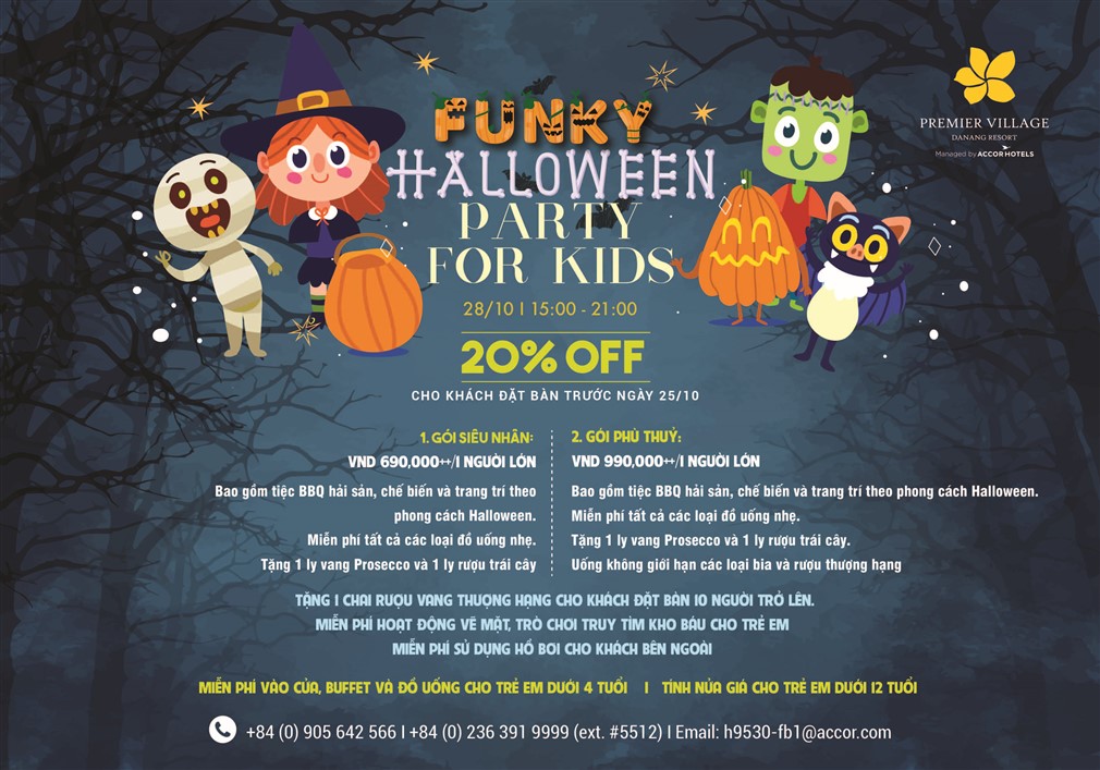 Gói ưu đãi “Siêu nhân” trị giá 690.000VND++/người lớn và gói “Phù thủy” trị giá 990.000VND ++/ người lớn được áp dụng cho khách nghỉ dưỡng tại resort hoặc những gia đình đang tìm kiếm một điểm vui chơi Halloween thật phong cách tại Đà Nẵng trong dịp này. Tin vui hơn nữa là các gói ưu đãi này đều miễn phí cho trẻ em dưới 4 tuổi đi kèm người lớn, và giảm giá tới 50% cho trẻ em từ 4-12 tuổi.