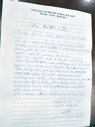Trong thư xin lỗi, tài xế Dũng viết: “ Tôi là người đạp xích lô chở ông Oki Toshiyuki vào khoảng 6 giờ 45 phút ngày 3.8 về khách sạn Riverside (Liberty Central SaiGon Riverside, quận 1 – PV). Khi dừng xe, tôi có lấy của ông Oki Toshiyuki tổng số tiền 2,9 triệu đồng, nhưng chỉ được ông đồng ý cho 500 ngàn đồng. Qua sự việc trên, tôi vô cùng hối hận nên tôi xin lỗi ông Oki Toshiyuki và gia đình”. Trong thư, tài xế Dũng cũng mong được Oki Toshiyuki tha thứ.