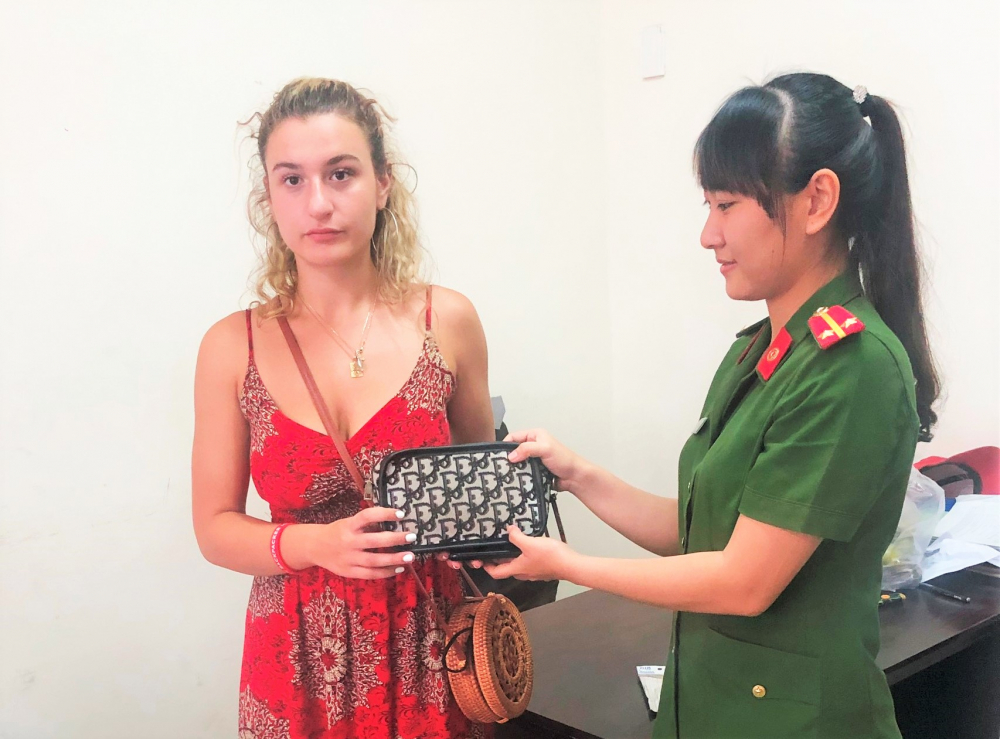 Nữ du khách nhận lại tài sản bị cướp. Ảnh: C.A