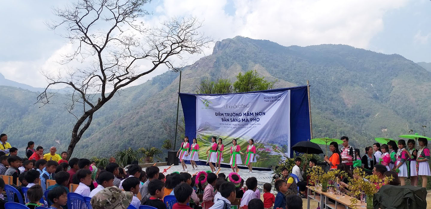 Bản Sàng Mà Pho thuộc xã biên giới Sin Suối Hồ có 77 hộ dân, toàn bộ là người dân tộc Mông, Dao với 71 cháu đang ở độ tuổi mầm non. Tuy nhiên, do trường không ra trường, lớp không ra lớp, nhà trường chỉ huy động được 46 cháu đến trường. Trước khi được nhóm thiện nguyện Cho Một Tương Lai từ thiện xây trường, 46 cháu học trong 2 phòng với tổng diện tích 60m2. Lớp học, sân chơi, bếp, nhà vệ sinh trống hơ trống hoác, hầu như không có gì. Vào mùa gió bão, nỗi sợ thường trực của cô trò là “tôn bay”. Có những lúc trường tốc hết mái, tan bão, cô trò được tìm thấy vẫn còn sợ hãi, trốn dưới gầm bàn.