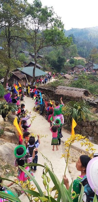 Hẹn trưởng bản dịp khác sẽ vào lại Sàng Mà Pho vì nếu ở lại cũng không biết ở đâu, cũng không muốn vì mình mà bà con phải vất vả tiếp đón. Đoàn chúng tôi xong việc trở ra trung tâm xã ngay trước khi trời tối, nếu không sẽ phải nằm lại giữa núi rừng. Tôi nhớ mãi hình ảnh khi vào tới bản, hai bên đường mòn nhỏ xíu, cô trò trường mầm non Sàng Mà Pho và người dân trong bản đứng vẫy cờ hoa chào đoàn. Nắng vàng rực, hoa lan Trần Mộng nở khắp lối đi. Một khoảng sân rộng nằm giữa mênh mông rừng núi một sân khấu được dựng lên. Các thành viên nam vận chuyển từng thùng quà, thực phẩm, quần áo vào tập kết quanh khu vực sân khấu để trao cho các con. Các thành viên nữ lo chuẩn bị tiết mục văn nghệ để biểu diễn cùng bà con. Chưa bao giờ bản Sàng Mà Pho có đoàn khách đông như thế. Người lớn nhìn khách chăm chú. Đám trẻ con nhảy chân sáo, thoăn thoắt từ tảng đá này sang tảng đá kia, những bàn chân trần bám chặt vào đất, truyền tay nhau những bông lan vừa hái được tặng khách.