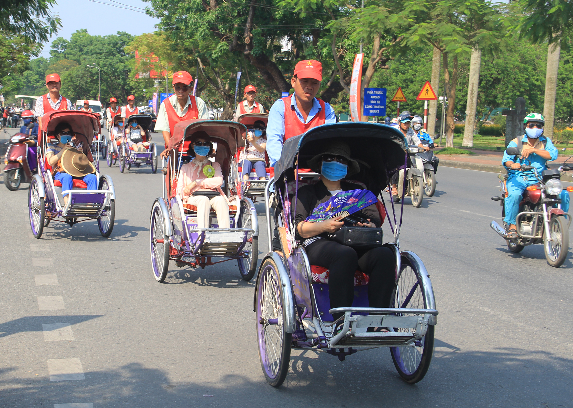 Các thành viên của Nghiệp đoàn xích lô du lịch Huế có cùng màu sơn xe, áo đồng phục khi phục vụ du khách
