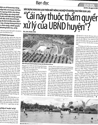 VHO-  Sau khi Văn Hóa có bài “Xây dựng khu du lịch trên đất nông nghiệp ở huyện Chư Păh (Gia Lai): Cái này thuộc thẩm quyền xử lý của UBND huyện”? (số 3721, ra ngày 11.5), UBND thị trấn Ia Ly, huyện Chư Păh đã tiến hành kiểm tra và đình chỉ hoạt động của cơ sở Farmstay Sâm Phát; đồng thời yêu cầu khẩn trương hoàn tất các thủ tục theo đúng quy định của pháp luật.